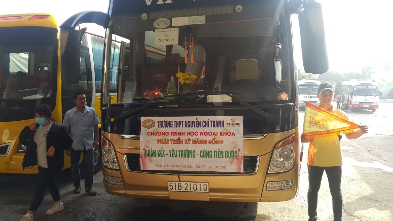 06h00: Xe và hướng dẫn THEME TRAVEL đón quý thầy cô và các bạn học sinh tại trường. Đoàn khởi hành đi Vĩnh Long. Hướng dẫn viên thuyết minh và tham gia chương trình hoạt náo vui tươi. Các em dùng bánh bao trên xe. Trên đường các em nghe thuyết minh về các địa danh nổi tiếng.