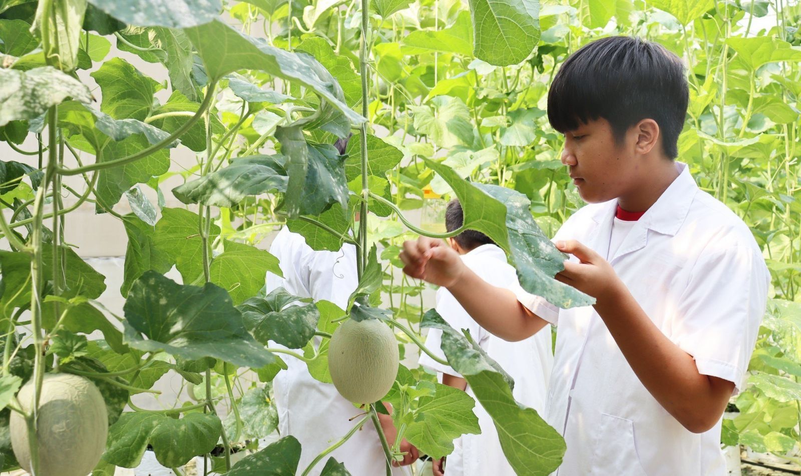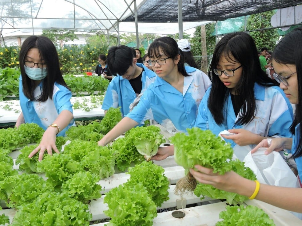 - Hấp dẫn hơn hết là hoạt động thực hành tại vườn thực hành nhà màng hoặc khu sản xuất. Các em được tham gia trải nghiệm trồng rau trên giá thể, trồng rau mầm, trồng và thu hoạch nấm, thu hoạch dưa lưới, dưa hoàng kim, cà chua bi, bầu bí, rau ăn lá các loại, trồng rau bán thủy canh.