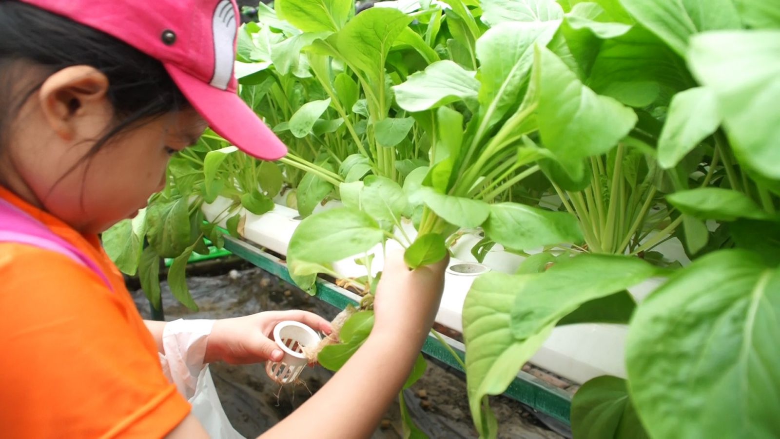 -   Hướng dẫn viên nhà nông bắt đầu hướng dẫn cho các em cách trồng và chăm sóc các loại rau trong nông trại: vườn rau công nghệ cao, mô hình trồng cà chua sạch, vườn cà chua bi, ớt, dưa leo, đậu bắp, cải thảo, rau muống, rau cải, rau dền, xà lách, mồng tơi.