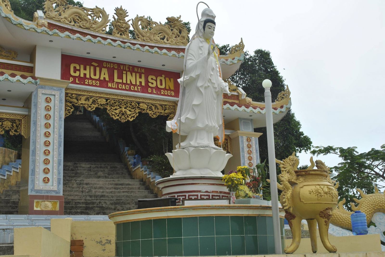 Chinh phục núi Cao Cát – Chùa Linh Sơn, một trong những ngôi chùa cổ và đẹp nằm trên đỉnh núi Cao Cát hùng vĩ. Để đến được với nơi đây, du khách sẽ phải đi lên một con dốc khá cao và leo lên vài chục bậc thang. Sau khi đã vượt qua hết, chắc chắn du khách sẽ cảm thấy công sức của mình không uổng phí khi được chiêm ngưỡng cảnh vật toàn đảo. Ngoài ra, núi Cao Cát được người dân đảo gọi là núi thiêng do có tượng Phật Quán Thế Âm Bồ Tát nằm ngay trên đỉnh núi. Đứng từ đây, chúng ta có thể chiêm ngưỡng toàn bộ cảnh quan và vẻ đẹp của Phú Quý. Chụp hình Phong điện, với những “chong chóng” điện gió khổng lồ, nơi sản xuất điện sạch cho người dân trên đảo.